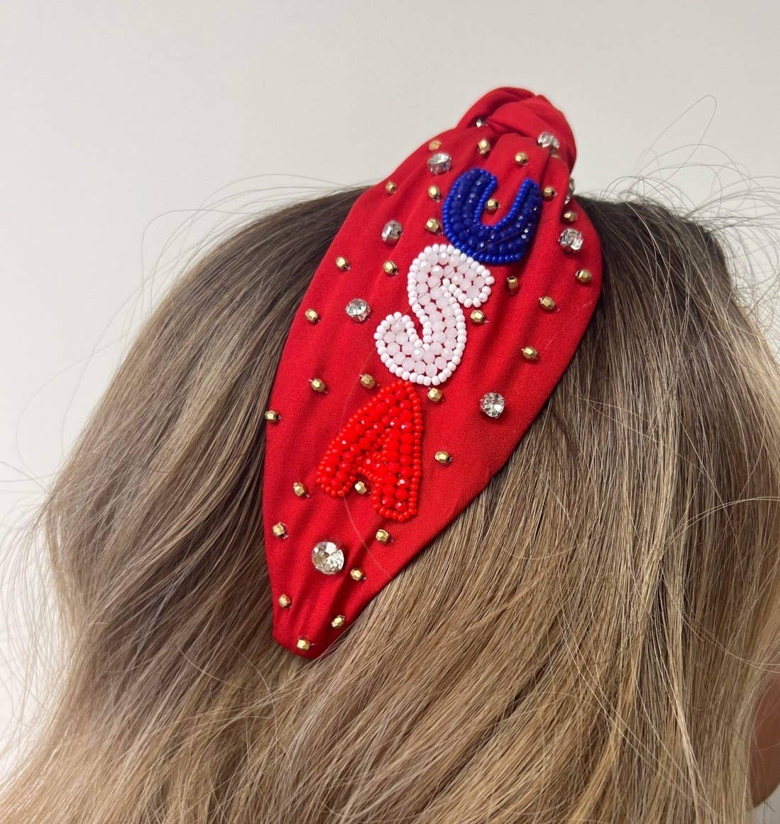 This headband is perfect for any patriotic event! Not only is it stylish with 'USA' beaded on it, but it's also bedazzled and adorned with little gems. It's the perfect statement piece, and will have everyone around you asking where they can get one.